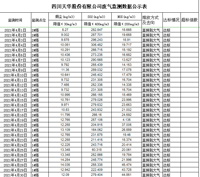 四川天華股份有限公司4月廢氣監(jiān)測(cè)數(shù)據(jù)公示