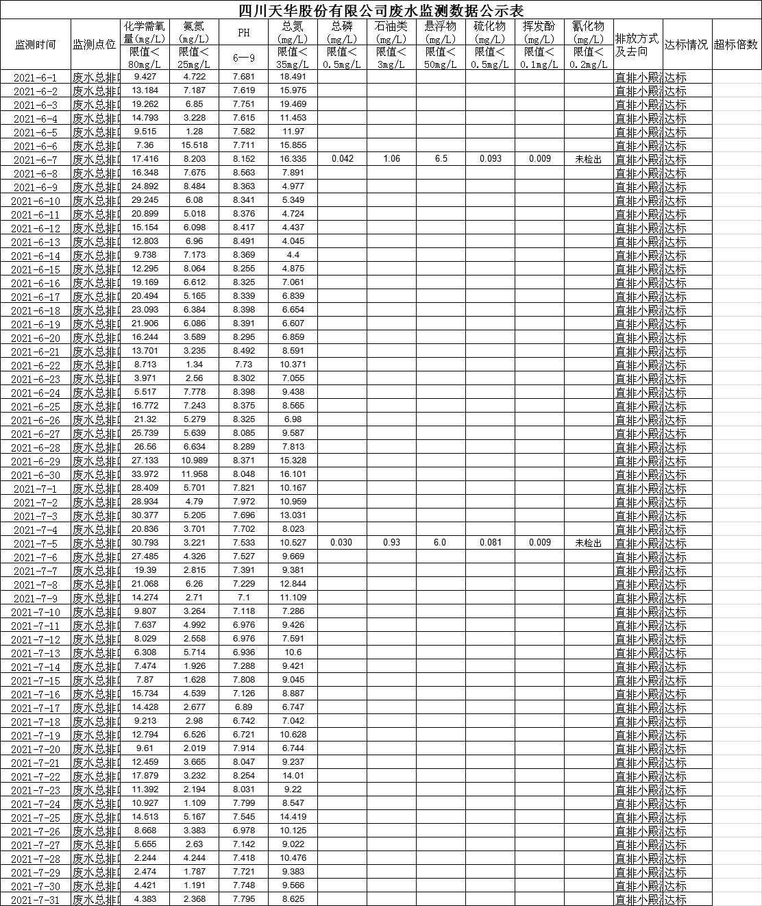 四川天華股份有限公司6月、7月廢水監(jiān)測數(shù)據(jù)公示