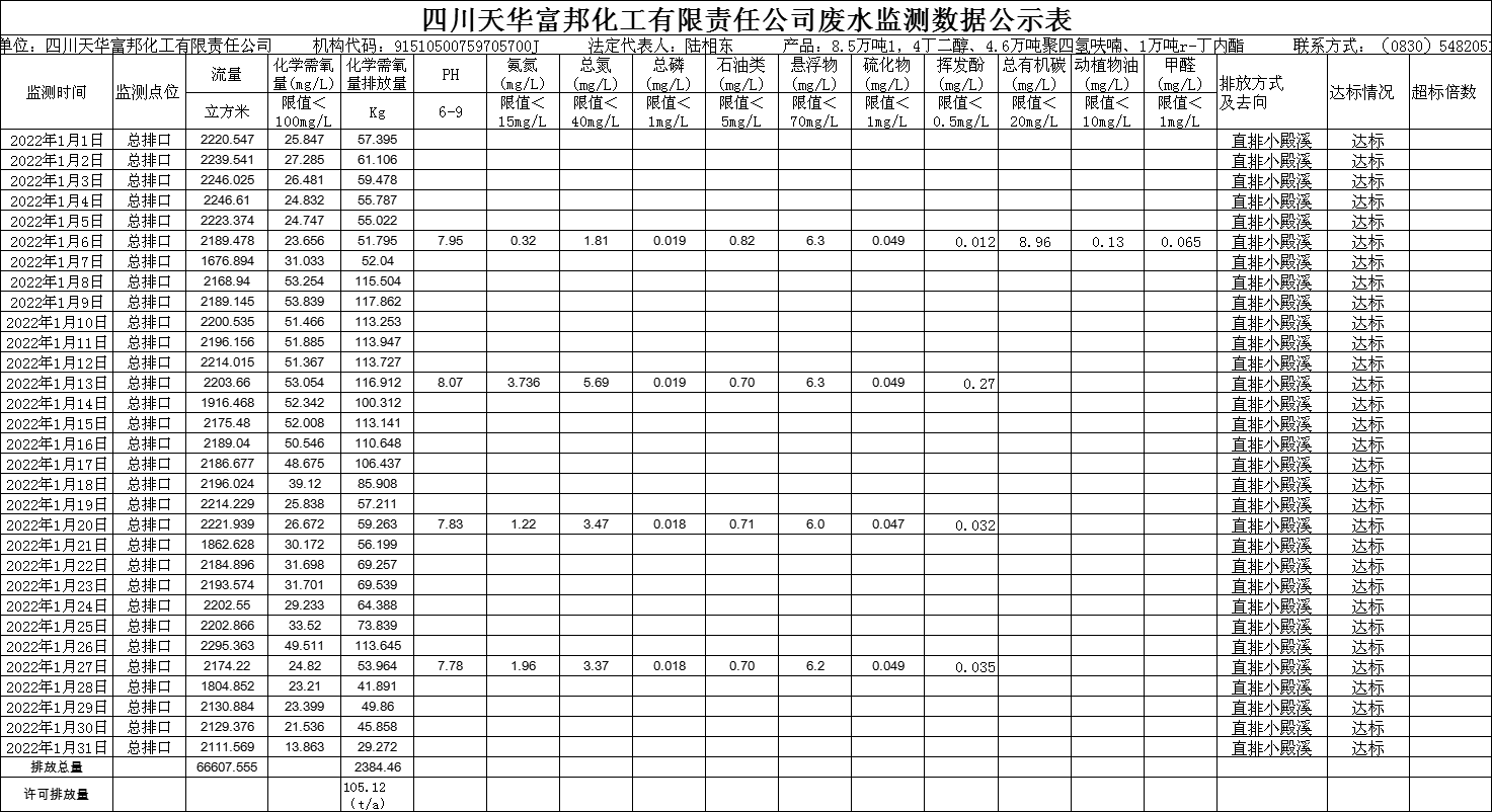 四川天華富邦有限責任公司2022年1月廢水監(jiān)測公示