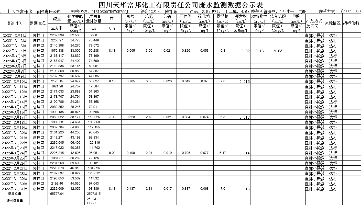 四川天華富邦化工有限責任公司2022年3月廢水監(jiān)測數(shù)據(jù)公示