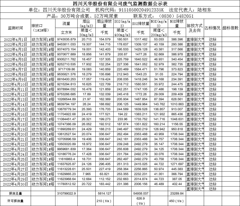四川天華股份有限公司2022年4月份廢氣監(jiān)測數(shù)據(jù)公示